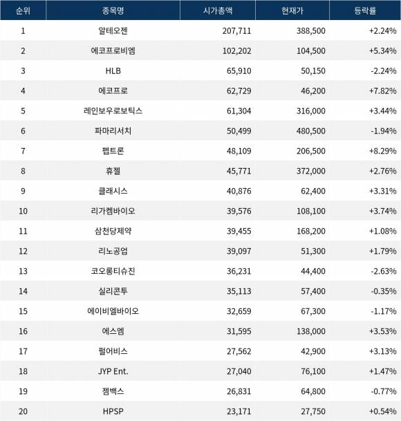 한국거래소에 따르면, 시가총액 1위인 알테오젠(196170)은 현재가 38만8,500원으로 전 거래일 대비 2.24% 상승하고 있다.