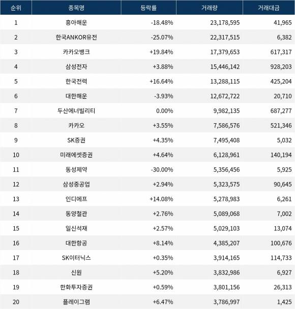 한편 거래량 상위 20위권 종목들은 동성제약(002210) ▼-30.00%, 삼성중공업(010140) ▲2.94%, 인디에프(014990) ▲14.08%, 동양철관(008970) ▲2.76%, 일신석재(007110) ▲2.57%, 대한항공(003490) ▲8.14%, SK이터닉스(475150) ▲0.35%, 신원(009270) ▲5.20%, 한화투자증권(003530) ▲0.59%, 플레이그램(009810) ▲6.47% 등의 성적을 기록했다.