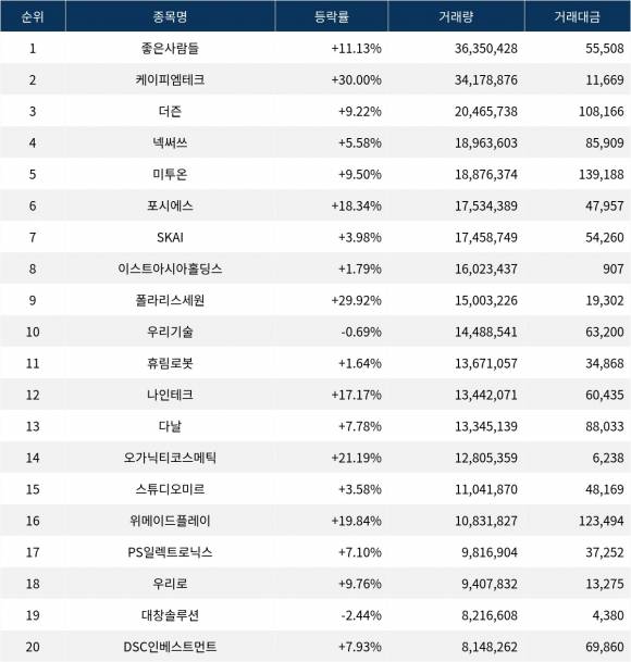 한편 거래량 상위 20위권 종목들은 휴림로봇(090710) ▲1.64%, 나인테크(267320) ▲17.17%, 다날(064260) ▲7.78%, 오가닉티코스메틱(900300) ▲21.19%, 스튜디오미르(408900) ▲3.58%, 위메이드플레이(123420) ▲19.84%, PS일렉트로닉스(332570) ▲7.10%, 우리로(046970) ▲9.76%, 대창솔루션(096350) ▼2.44%, DSC인베스트먼트(241520) ▲7.93% 등의 성적을 기록했다.