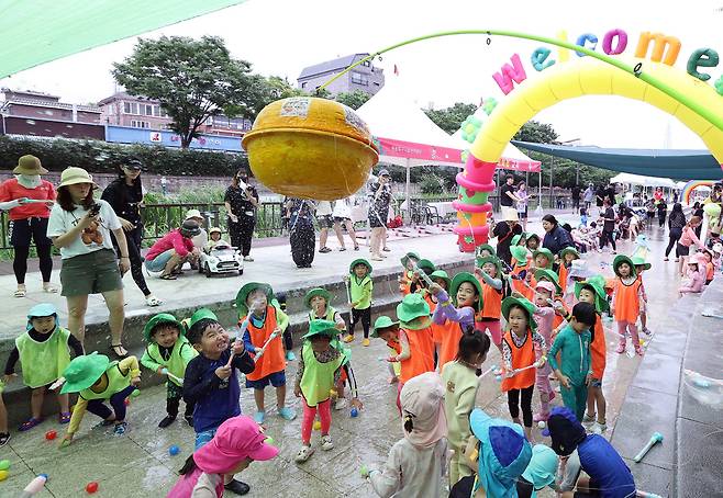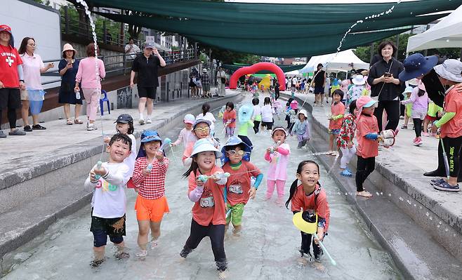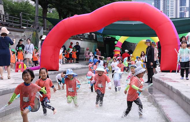 24일 서울 송파구 오금동 성내천 물놀이장을 찾은 어린이들이 물놀이를 하고 있다.