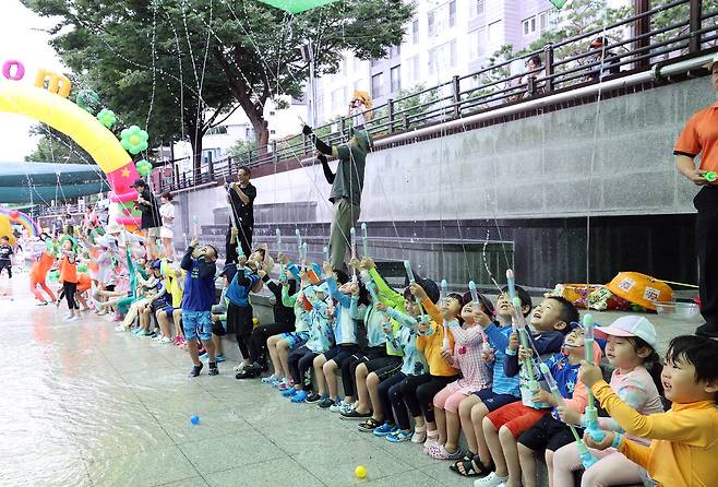 송파구는 여름철 어린이들에게 안전하고 즐거운 물놀이 공간을 제공하기 위해 성내천 물놀이장을 24일 개장했다.