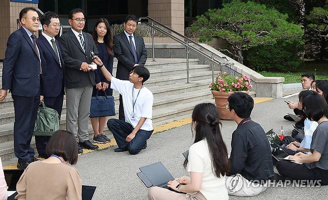 (과천=연합뉴스) 이진욱 기자 = 순직 해병 수사 방해 의혹 사건을 수사하는 이명현 특별검사가 24일 경기도 과천 고위공직자범죄수사처에서 오동운 공수처장과 면담을 마친 뒤 취재진 질문에 답하고 있다. 2025.6.24