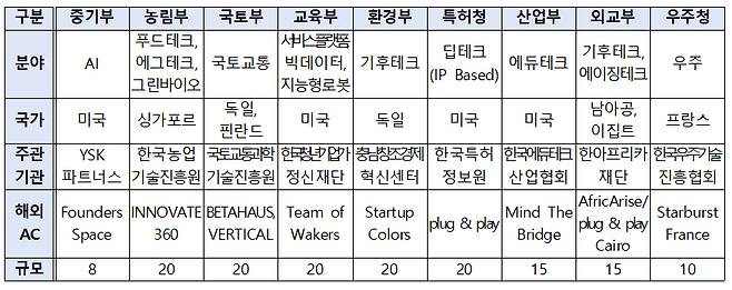 세부적으로 보면 사업 주무부처인 중기부는 올해 AI 스타트업 8곳을 선정해 AI 인프라가 풍부한 미국 시장 진출을 지원한다. 해외 AC로는 파운더스스페이스와 협업한다. 그밖에 농림축산식품부는 푸드테크·에그테크·그린바이오 스타트업 20곳의 싱가포르 진출, 우주항공청은 우주 분야 스타트업 10곳의 프랑스 진출 등을 지원할 예정이다.