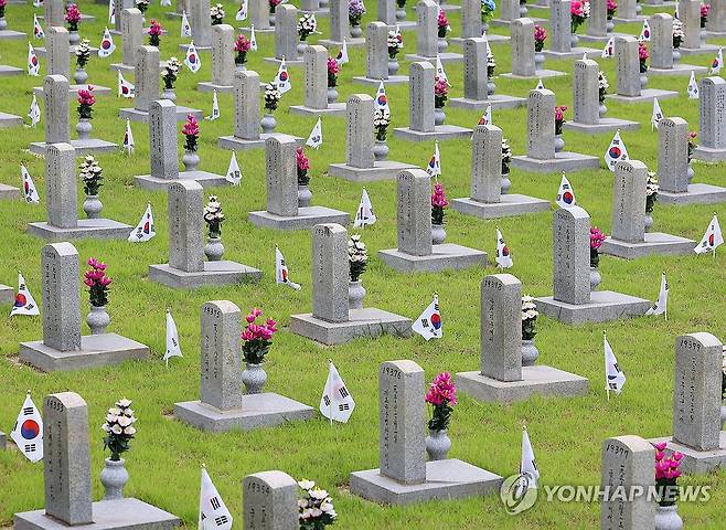 (서울=연합뉴스) 김도훈 기자 = 6·25 전쟁 75주년을 하루 앞둔 24일 서울 동작구 국립서울현충원 장병 묘역이 태극기와 조화로 가꾸어져 있다. 2025.6.24
