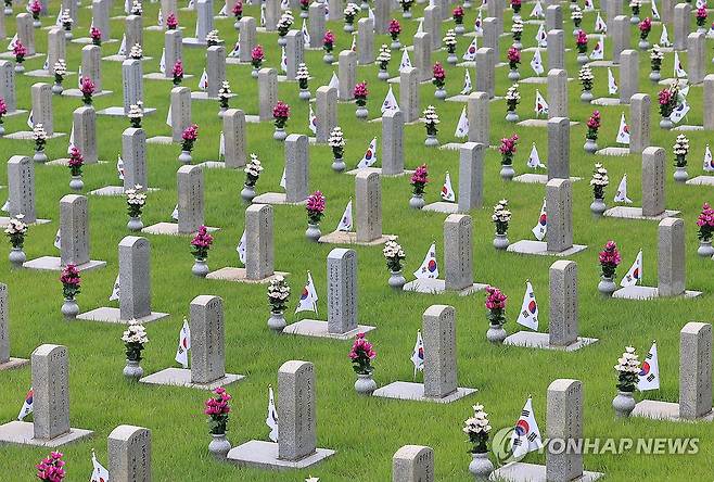 (서울=연합뉴스) 김도훈 기자 = 6·25 전쟁 75주년을 하루 앞둔 24일 서울 동작구 국립서울현충원 장병 묘역이 태극기와 조화로 가꾸어져 있다. 2025.6.24