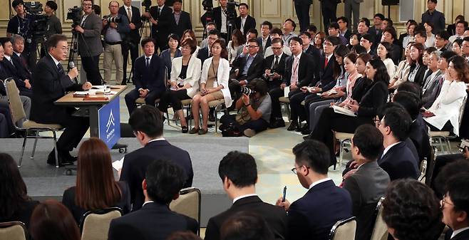 | ▲ 2017년 8월 17일 문재인 대통령이 취임 100일을 맞아 청와대 영빈관에서 출입기자들과 취임 후 첫 기자회견을 하고 있다. |