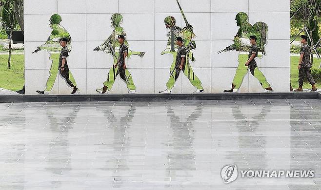 (오산=연합뉴스) 홍기원 기자 = 6·25 전쟁 75주년을 하루 앞둔 24일 경기도 오산시 죽미령평화공원을 찾은 육군 제51보병사단 장병들이 유엔 스미스 특수임무부대의 행군 모습이 새겨진 조형물을 지나고 있다. 2025.6.24