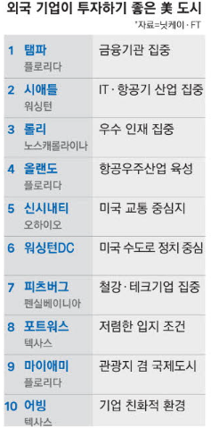 24일 일본 니혼게이자이신문(닛케이)과 영국 파이낸셜타임즈(FT)는 '인베스팅 인 아메리카'와 함께 미국 인구 수를 감안한 91개 대도시를 대상으로 외국기업에게 투자여건이 좋은 도시를 조사한 결과를 발표했다.
