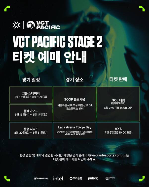 한국에서 열리는 VCT 퍼시픽 스테이지 2의 조별 예선 및 플레이오프의 티켓은 6월 27일부터, 일본에서 열리는 결승 진출전과 최종 결승전의 티켓은 7월 6일부터 판매된다.