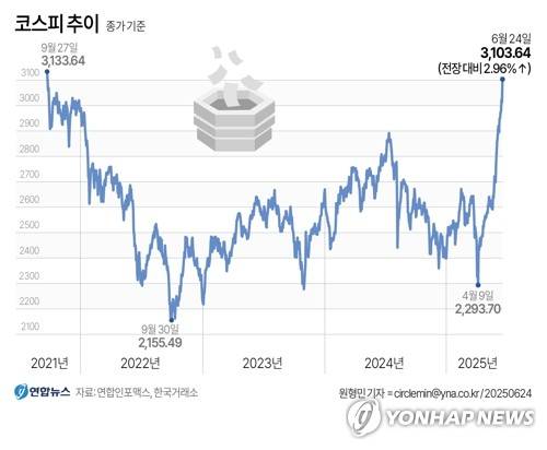 (서울=연합뉴스) 원형민 기자 = 24일 코스피 지수는 전장보다 89.17포인트(2.96%) 오른 3,103.64로 장을 마쳤다.