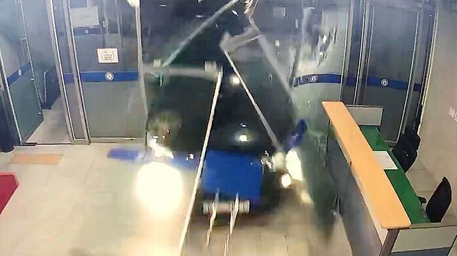 SUV는 현관 유리문을 뚫고 건물 내부 벽면을 들이받은 뒤 멈춰 섰으며 다행히 인명피해는 없었습니다.