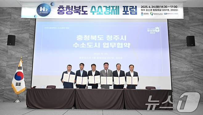 진수남 한국가스기술공사 사장 직무대행(왼쪽부터), 김동욱 현대차그룹 전략기획실장(부사장), 김영환 충북도지사, 이범석 청주시장, 박경국 한국가스안전공사 사장, 이중호 한국전력공사 충북본부장 등 주요 관계자들이 업무협약식에서 기념 촬영을 하고 있다. (현대차그룹 제공. 재판매 및 DB 금지) 2025.6.24/뉴스1