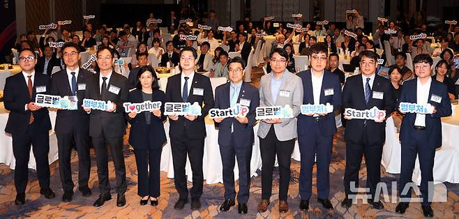 [서울=뉴시스] 추상철 기자 = 김성섭(왼쪽 여섯번째) 중소벤처기업부 차관이 24일 오후 서울 종로구 포시즌호텔에서 열린 '범부처 스타트업 해외진출 출범식'에서 각 부처 임원 등 참석자와 함께 기념촬영을 하고 있다. 2025.06.24. scchoo@newsis.com