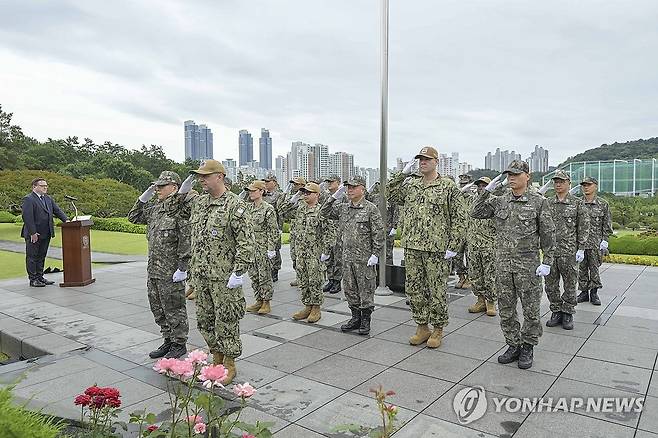 (부산=연합뉴스) 6·25전쟁 75주년을 하루 앞둔 24일 한미 해군 주임원사단이 부산 남구 UN기념공원을 찾아 상징구역을 참배하고 전사자 묘역을 둘러보고 있다. 이날 행사에는 김요한 해군 주임원사와 니콜라스 메시나(Nicholas Messina) 주한미해군사령부(CNFK) 주임원사 등 한미 주임원사 24명이 참석했다. 2025.6.24 [해군작전사령부 제공. 재판매 및 DB 금지]
