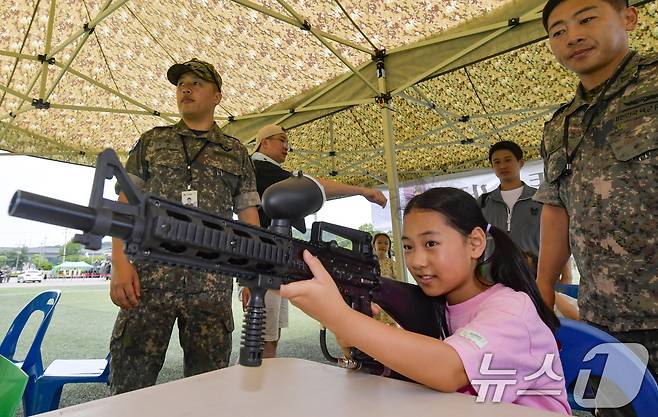 (화성=뉴스1) 경기사진공동취재단 = 24일 화성 육군 제51보병사단 전승신병교육대에서 열린 '2025년도 부대개방행사'에서 어린이가 페인트총 사격체험을 하고 있다. 2025.6.24/뉴스1