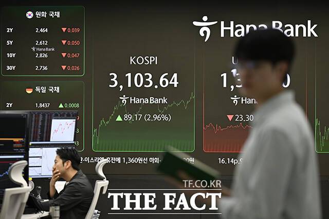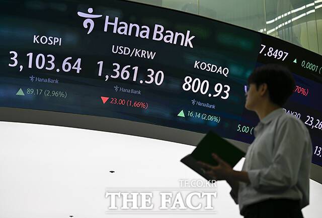 [더팩트ㅣ장윤석 기자] 코스피가 89.17p(2.96%) 오른 3103.64, 코스닥 16.14(2.06%) 오른 800.93에 거래를 마친 24일 오후 서울 중구 하나은행 본점 딜링룸 전광판에 지수가 나타나고 있다.