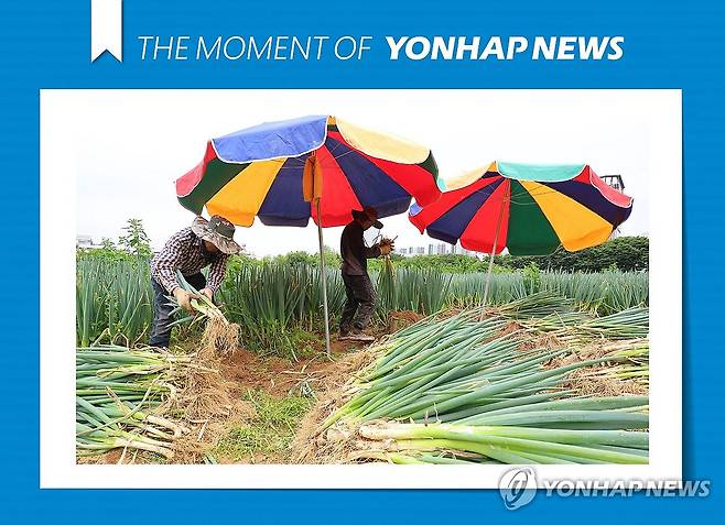 (인천=연합뉴스) 임순석 기자 = 장맛비가 예고된 24일 인천 남동구 구월동의 한 농장에서 농부들이 무더위 속에 대파를 수확하고 있다. 2025.6.24 [THE MOMENT OF YONHAPNEWS]