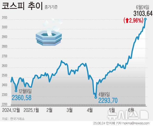 [서울=뉴시스] 이스라엘과 이란의 휴전 합의에 금융시장이 출렁였다. 24일 코스피는 지난 2021년 9월 27일(3133.64) 이후 3년 9개월 만에 3100선을 돌파했다. 원·달러 환율은 전일대비 24.1원 급락해 1360.2원으로 떨어졌다. (그래픽=안지혜 기자)