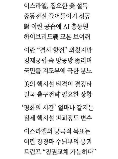 미국의 직접 개입을 마주하며 결국 이스라엘과 휴전으로 국면 돌파를 선택한 이란 강경파 지배층은 정권 생존을 위해 치열한 출구전략 계산을 하고 있을 것이다. 이란은 24일 "이스라엘 공격 중단 시 우리도 대응 의사가 없다"고 밝혔다. 이란은 향후 미국, 이스라엘과 협상 과정에서 어떤 방식으로든 파괴된 핵시설에 대한 평가 압박을 받을 것으로 보인다. 그렇다고 잠깐의 휴전 후 다시 반격을 도모하는 것도 현실적으로 쉽지 않다. 이란의 대리 세력들은 사실상 껍데기만 남은 상태다. 한때 이란의 최대 전략자산이었던 헤즈볼라조차 지금은 조직의 생존을 걱정해야 할 정도로 약화돼 이스라엘·이란 전선에 휘말리는 것을 꺼리고 있다.