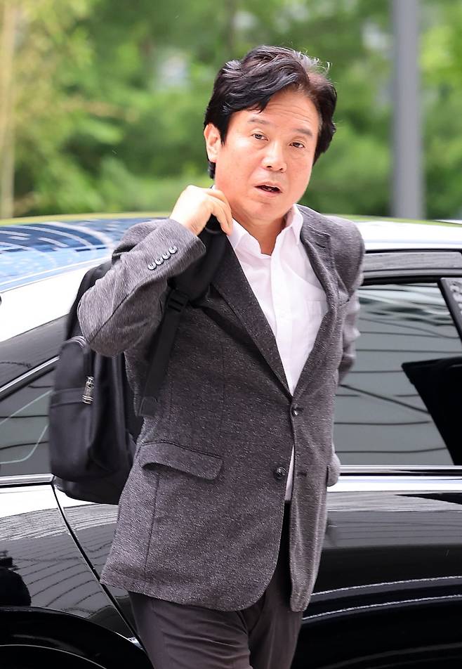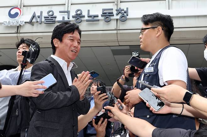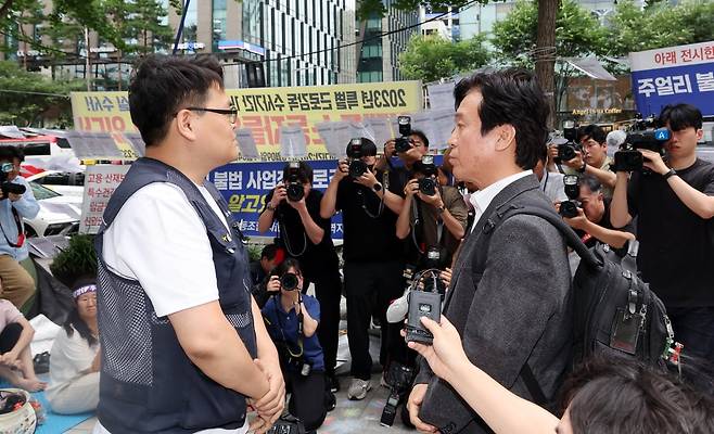김영훈 고용노동부 장관 후보자가?24일 오후 서울 중구 서울지방고용노동청 앞에서 집회 중이던 민주노총 금속노조 주얼리분회 조합원과 대화하고 있다.