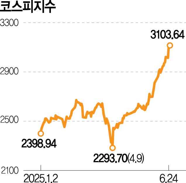 외인·기관 폭풍 매수에 대형주 '들썩'···코스피, 3년 9개월만 3100 돌파