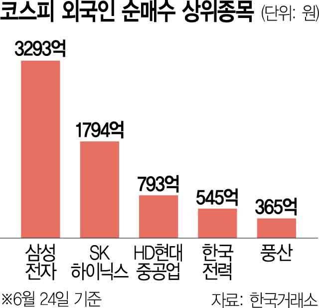 순매수 자금 대부분은 국내 시총 1·2위 삼성전자와 SK하이닉스로 흘러들어갔다. 미국 메모리 반도체 기업 마이크론의 실적 발표를 앞두고 고대역폭메모리(HBM) 수요 증가에 대한 낙관적인 전망이 쏟아졌다는 점이 작용했다. 외국인들은 이날 하루 동안 삼성전자와 SK하이닉스 주식을 각각 3293억 원어치, 1794억 원어치 사들였다.