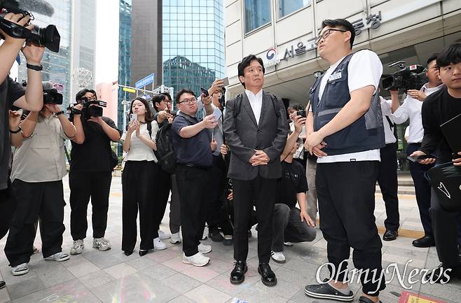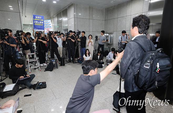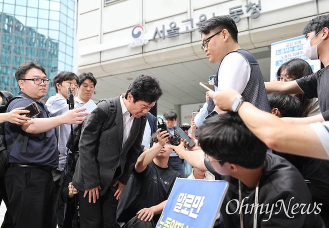 질의응답을 마친 김 후보자가 사무실로 올라가기에 앞서 서울지방고용노동청 앞에서 농성 중인 금속노조 서울지부 동부지역지회 주얼리분회 노동자들과 이야기를 나눈 뒤 인사를 하고 있다.