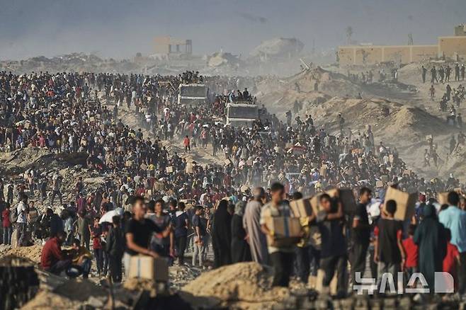[가자시티(가자지구)=AP/뉴시스]팔레스타인인들이 지난 16일 가자시티로 향하던 세계식량계획(WFP) 구호 트럭에서 받은 식량과 인도주의적 원조 물품을 담은 자루와 상자 등을 들고 있다. 이스라엘군과 드론이 24일 새벽 가자지구 중심부에서 구호 트럭을 기다리던 팔레스타인인 수백명을 향해 총격을 가해 최소 25명이 사망했다고 팔레스타인 목격자들과 병원들이 밝혔다. 2025.06.14.