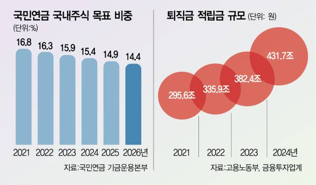 실제 연기금은 이달 들어(23일 기준) 코스피에서 외국인이 4조 4503억 원을 순매수하는 와중에도 2673억 원어치를 팔아치웠다. 연기금 중 국민연금 비중이 가장 높다는 점에서 실질적 매도 주체로 지목된다. 대다수 증권사들이 올해 하반기~내년 상반기 코스피 상단을 3000 중후반대로 눈높이를 높이고 있는 것과는 상반된 움직임이다. 김병연 NH투자증권 투자전략부 이사는 “당정이 추진 중인 자본시장 활성화 정책들이 제대로 시행되면 외국인의 패시브 자금이 본격적으로 유입될 수 있다”고 짚었다. 그럼에도 국민연금은 내년 국내 주식 비중을 올해보다 더 낮춰야 하는 상황이다. 국민연금은 국내 주식 비중을 내년부터 매년 0.5%포인트씩 줄여 2029년에는 13%까지 축소할 계획이다.