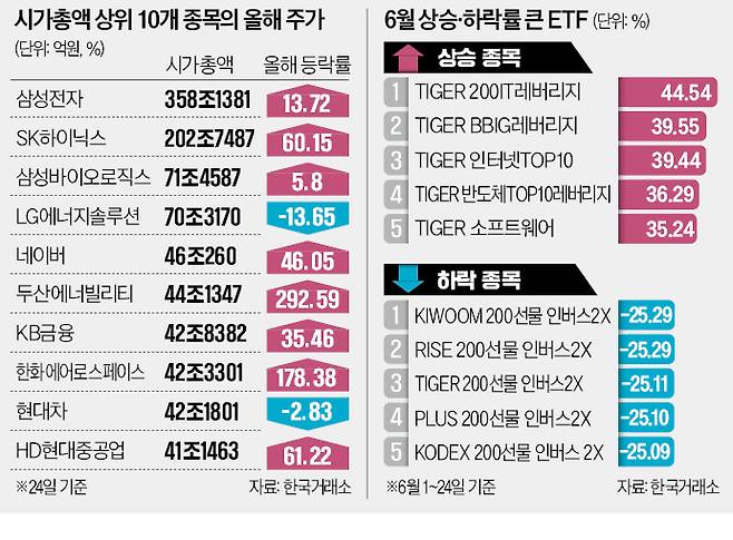 한국거래소에 따르면 이달 들어 거래량이 가장 많은 ETF는 ‘KODEX 200선물 인버스2X’로 거래대금만 8조원에 달했다. ‘KODEX 인버스’와 ‘KODEX 코스닥150선물 인버스’도 같은 기간 각각 거래대금 2위, 4위에 이름을 올렸다. 지수는 상승 일변도지만 곧 조정될 것으로 전망하는 투자자가 적지 않다는 의미다. 개인은 최근 1주일간(16~24일) KODEX 200선물 인버스2X ETF를 1237억원어치 순매수했다.