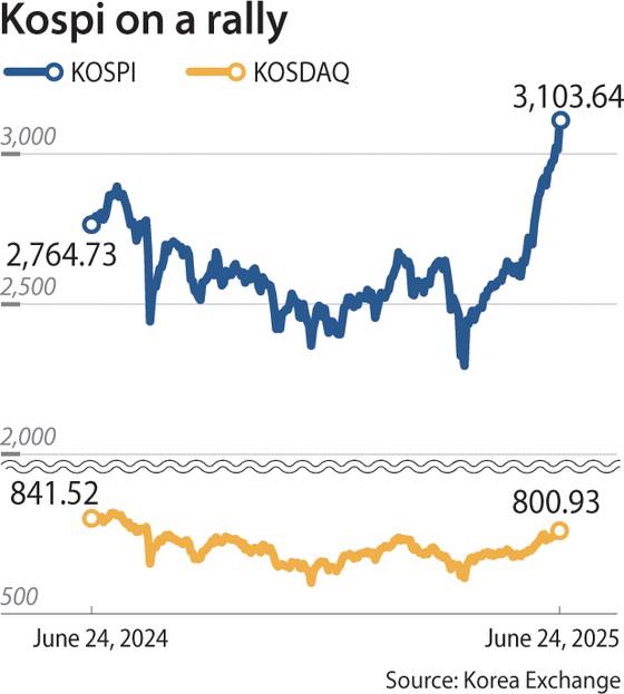 ![A board at the Korea Exchange Seoul office in western Seoul shows the Kospi closing at 3,103.64 on June 24, up 2.96 percent from the previous trading day. [YONHAP]](https://img2.daumcdn.net/thumb/R658x0.q70/?fname=https://t1.daumcdn.net/news/202506/24/koreajoongangdaily/20250624184542533phvw.jpg)