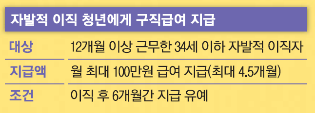 고용부는 자발적 이직 청년에게 생애 1회 구직급여(실업급여)를 지급하는 방안도 추진한다. 34세 이하 청년을 대상으로 우선 추진하는데, 4개월간 월 최대 100만원을 지급한다. 부작용을 최소화하기 위해 이직 후 6개월의 지급 유예 기간을 두기로 했다.