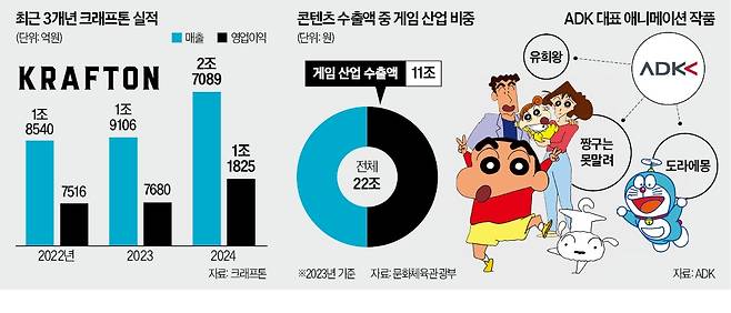 24일 크래프톤은 일본 종합 광고회사 ADK그룹을 소유한 BCJ-31(ADK홀딩스의 모회사)을 750억엔(약 7103억원)가량에 인수했다고 공시했다. ADK는 일본 3대 광고회사 중 한 곳이다. ‘짱구는 못말려’ ‘도라에몽’ ‘유희왕’ 등 300편 넘는 인기 애니메이션 제작에 참여해온 ADK의 연간 거래액은 3480억엔(약 3조2667억원)에 달한다.