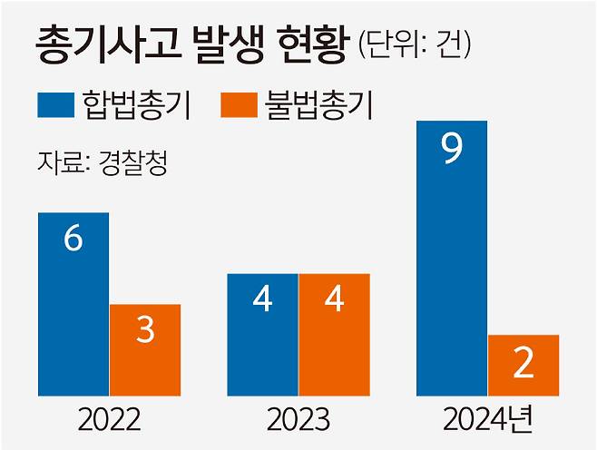 24일 경찰청에 따르면 최근 3년간 국내에서 발생한 총기사고 28건 중 19건(68%)은 총기 소지허가자에 의한 사고로 집계됐다. 총기 소지허가자 사고는 2022년 6건, 2023년 4건, 지난해 9건이었다. 반면 불법 총기로 인한 사고는 2022년 3건, 2023년 4건, 지난해 2건으로 합법 총기로 인한 사고보다 적다.