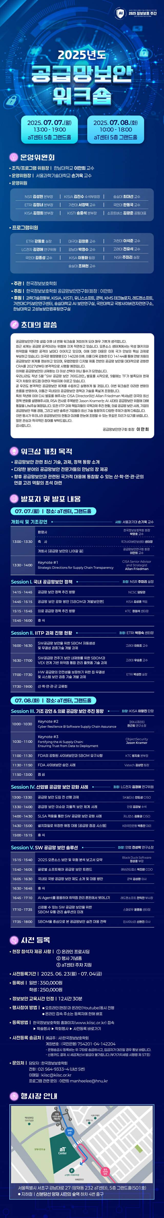 이런 흐름 속에서 한국정보보호학회 산하 공급망보안연구회(회장 이만희 교수)가 오는 7월 7일(월)~8일(화) 이틀간 서울 양재동 aT센터 5층 그랜드홀에서 ‘2025년도 공급망보안 워크숍’을 개최한다.