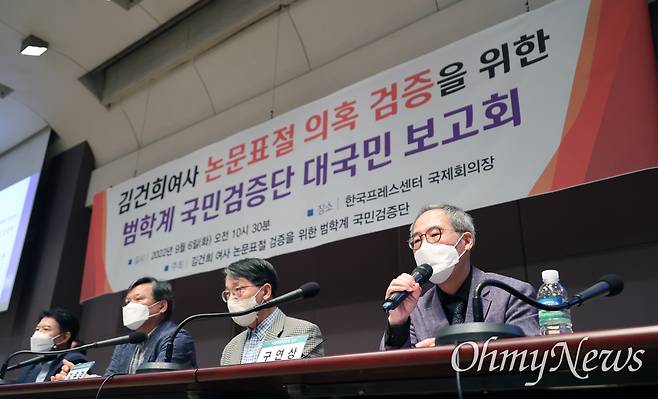 | ▲ 김건희로부터 논문을 도용당한 구연상 숙명여대 교수가 2022년 9월 6일 오전 서울 중구 프레스센터에서 열린 '김건희 여사 논문 표절 의혹 검증을 위한 범학계 국민검증단 대국민 보고회'에 참석해 발언하고 있다. |
