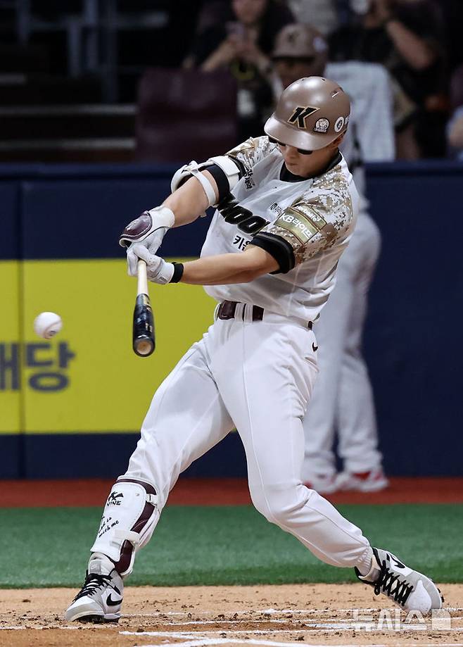 [서울=뉴시스] 배훈식 기자 = 24일 오후 서울 구로구 고척스카이돔에서 열린 2025 신한 쏠뱅크 KBO리그 키움 히어로즈와 기아 타이거즈의 경기, 2회말 키움 선두타자로 나선 이주형이 팀의 첫 안타를 뽑아내고 있다. 2025.06.24. dahora83@newsis.com
