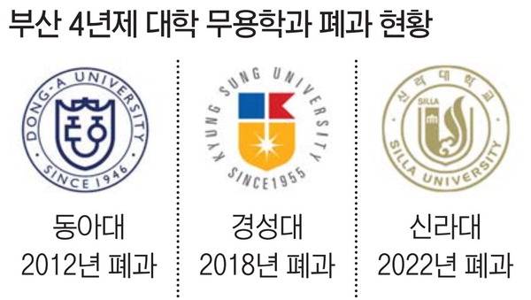 애초 무용학과가 있는 부산지역 4년제 대학은 3곳이 더 있었으나 최근 10여 년 사이 모두 없어졌다. 1983년 설립된 동아대 무용학과는 2011년 이후 신입생이 끊기면서 2012학년도부터 모집을 중단했다. 경성대 무용학과는 2018학년도에 폐과됐다. 학생들의 중도 탈락률이 다른 학과 평균과 비교해 높다는 이유에서였다. 신라대도 2022학년도부터 무용학과 신입생 모집을 중단했다.