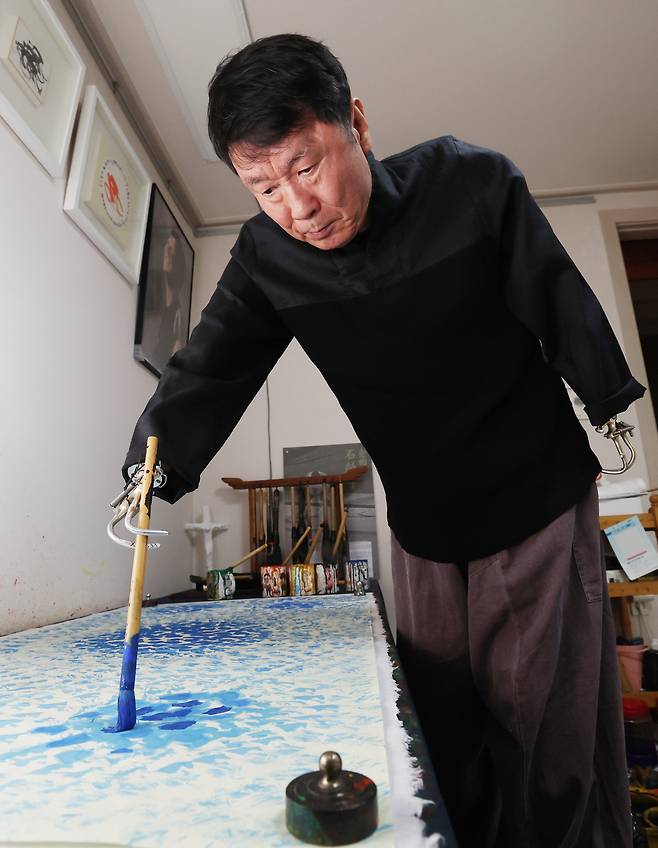 석창우 화백은 불의의 사고로 입은 신체 장애를 딛고 30여 년간 ‘의수화가’로 활동해 인간 승리의 표본으로 불린다. 1000여 장애예술인의 대표가 된 석 화백은 “그간 내 작업에만 몰두하였지만, 앞으로 동료 장애예술인들의 창작여건을 개선하고 장애 때문에 예술성이 낮게 평가받지 않는 예술적인 환경을 조성하는 데 최선을 다하겠다”고 밝혔다. 그가 자택 작업장에서 동양의 서예와 서양의 크로키를 접목한 ‘수묵크로키’ 작업을 하고 있다. 이제원 선임기자
