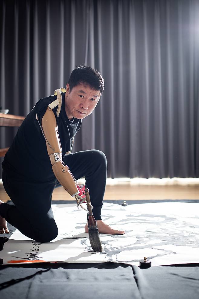 “1990년대까지는 주로 서예가로 활동했다. 대한민국 서예대전 등 각종 공모전에서 상을 많이 받았다. 어느 정도 자리를 잡게 되니 나만의 화법을 갖고 싶었다. 1999년에 우연히 누드 크로키 강의를 접하고 사람의 몸이 새로운 형상으로 꿈틀거리는 것에 매료됐다. 그때부터 붓 대신 연필을 의수에 끼우고, 온종일 연습했다. 반려견부터 아침에 조깅하는 사람까지 인체의 움직이는 모든 것을 짧은 시간 안에 특징을 잡아 그리는 작업을 반복했다. 크로키가 익숙해질 때쯤 붓을 다시 끼웠다. 먹에 묵을 곱게 갈아 붓을 적셨다. 오랜 연습 끝에, 나만의 ‘수묵 크로키 화법’을 만들었다. 간결하면서도 힘 있는 붓 터치로 대상의 순간 움직임을 포착해 빠른 시간에 표현하는 기법이다.”