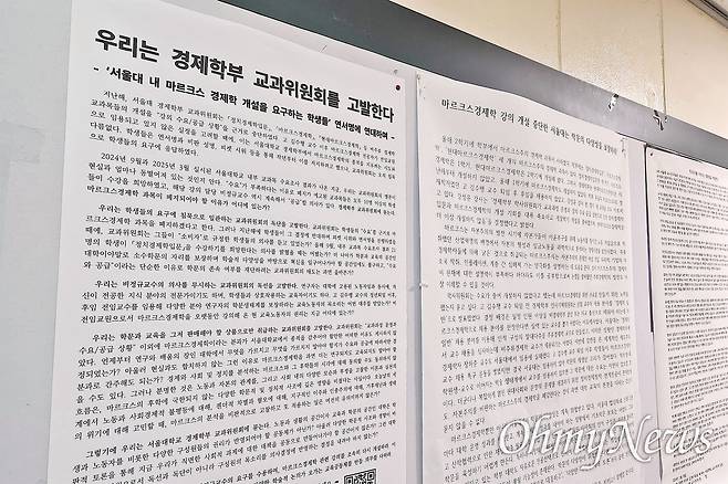| ▲ '0학점 공개강의' 형태로 부활한 서울대 마르크스 경제학 강의(정치경제학입문)의 첫 수업이 서울 관악구 서울대 사회과학대학 16동 110호에서 진행됐다. 강의실 앞에 서울대의 강의·강사 채용 배제를 비판하는 대자보들이 붙어 있다. |