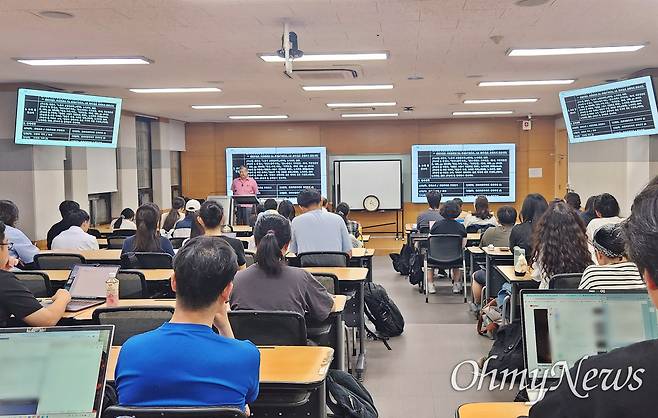 | ▲ '0학점 공개강의' 형태로 부활한 서울대 마르크스 경제학 강의(정치경제학입문)의 첫 수업이 서울 관악구 서울대 사회과학대학 16동 110호에서 진행됐다. 주최 측(서울대학교 내 마르크스 경제학 개설을 요구하는 학생들) 예상보다 모집 인원이 많아 강의는 유튜브로도 생중계됐다. |