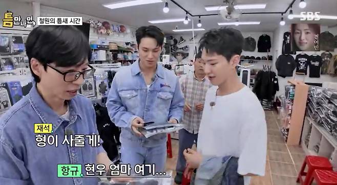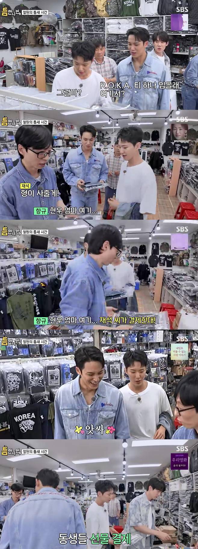 민규는 군용 티셔츠를 보여주며 "우리 R.O.K.A 티 하나 입어볼래?"라고 권했고, 유재석은 "형이 사줄게"라며 선뜻 계산에 나섰다.