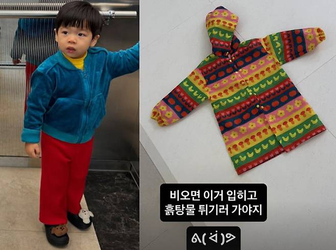 사진 속 제이쓴은 장마 기간을 앞두고 아들 준범 군의 우비를 산 모습. 알록달록한 색깔에 화려한 무늬가 새겨진 개성 넘치는 우비의 디자인이 시선을 사로잡는다.