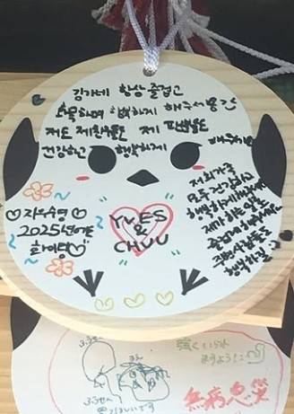 또 다른 사진에서는 츄가 일본 전통 사찰로 보이는 장소에서 소원을 적은 모습이 담겼다. 나무 팻말에는 “팬분들 건강하고 행복하게 해주세요”라는 귀엽고 진심 어린 메시지가 적혀 있다.