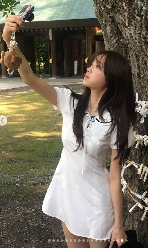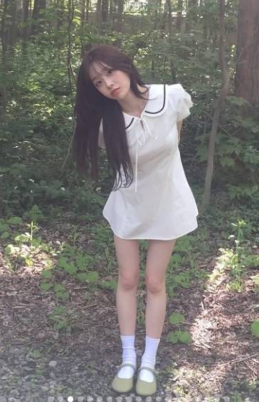 공개한 사진 속 츄는 울창한 숲을 배경으로 하얀 미니 원피스를 입고 다양한 포즈를 취하고 있다.