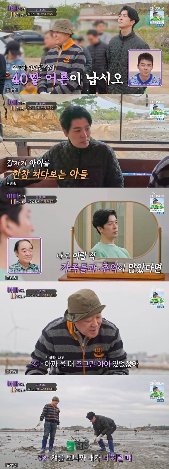 한창 갯벌 체험을 하던 장광은 "아까 올 때 조그마한 아이 있었지 않냐. 개를 보니까 내가 너 그만할 때 안 데리고 다닌 게 너무 미안하더라. 그때 그런 체험도 해봤으면 좋았을 텐데. 걔는 그나이에 벌써 세 번 체험한다는데 너는 40세에 첫번째 체험이잖아. 되게 미안하더라"라고 아들과 같은 생각을 했음을 밝혔다.