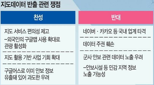 구글이 국내 지도의 국외 반출을 18년 동안 3차례 요구한 것을 두고 찬반 논쟁이 격화하고 있다. 국내 고정밀 지도 데이터를 구글, 애플 등 글로벌 기업에 제공하면 국가 안보 관련 우려가 커진다는 입장과 이용자 편의를 위해 지도 데이터를 제한적으로나마 제공해야 한다는 주장이 맞서는 중이다. 최근 한·미 관세 협상 테이블에도 지도 반출 사안이 포함된 것으로 알려지면서 지도 데이터를 둘러싼 논란이 재부상하는 양상이다.