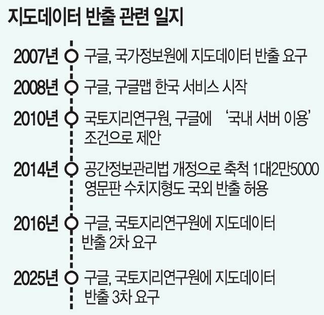구글이 국내 지도 데이터 반출을 요청한 것은 2007년으로 거슬러 올라간다. 구글은 2008년 구글맵의 한국 서비스를 앞두고 지도 데이터 제공을 거듭 요청했지만, 당시 정부는 안보 우려 등을 이유로 들어 반출을 허가하지 않았다. 구글 측은 그러나 2016년 2차 요구에 이어 지난 2월 또다시 지도 데이터 반출을 요청했다. 구글에 이어 애플도 지난 16일 국토지리정보원에 5000 대 1 축척의 고정밀 지도 데이터의 국외 반출을 요구했다. 애플 역시 앞서 2023년 지도 데이터 반출을 요청했다가 정부 불허에 막힌 바 있다.