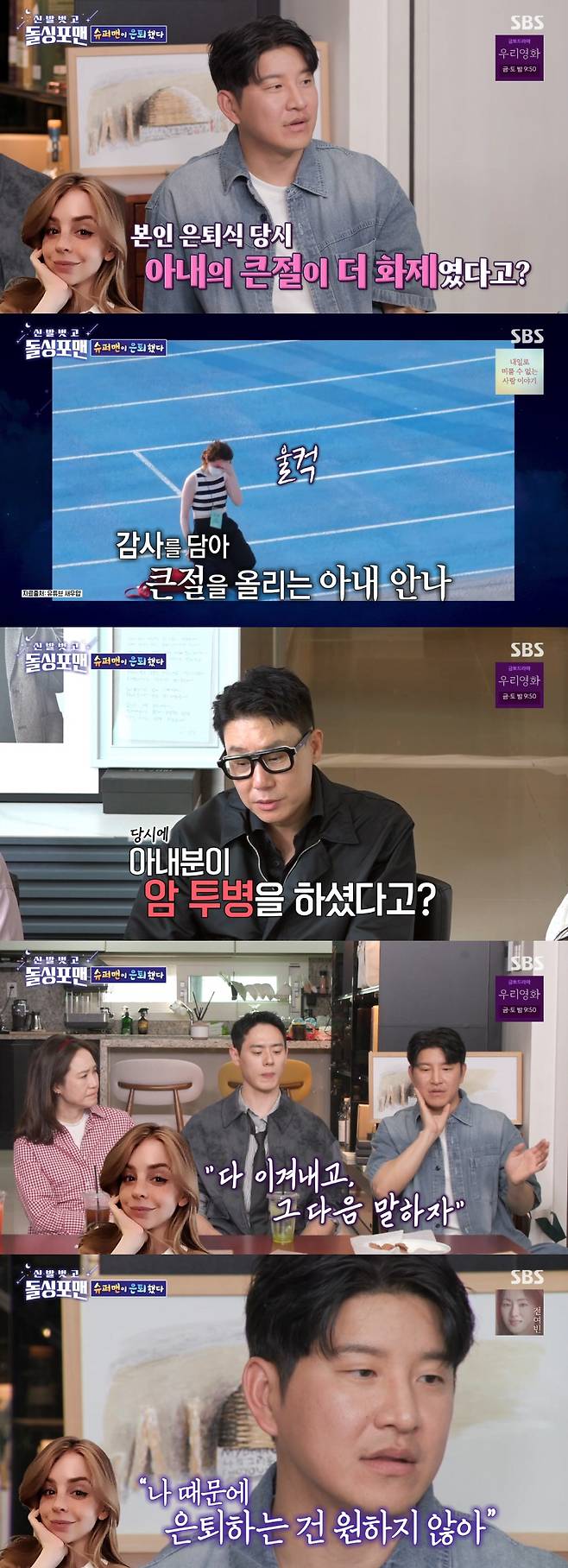 이어 "아내가 자기는 외국인이고 말로 표현할 수가 없으니까 카메라가 빠진 다음에 한국식으로 인사를 큰절로 한 거다. 나는 그때 은퇴 소감 이야기하고 있었는데 보면 (팬들이) 박수치는 게 다 아내한테 박수치는 거였다"고 말했다.